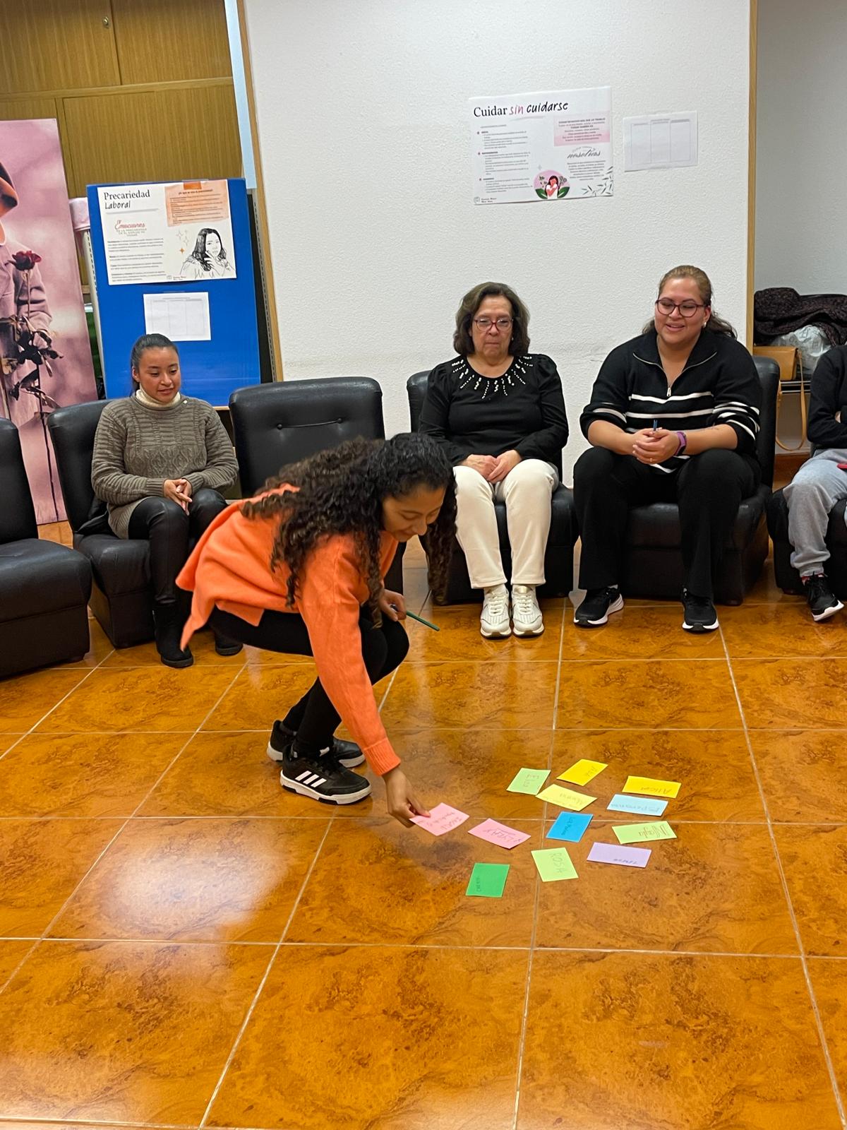En la sala se habían dispuesto cinco carteles, uno por cada eje, que recogían las emociones más frecuentes en cada ámbito. Junto a ellos, las participantes podían señalar con gomets si se sentían identificadas, si no se reconocían en lo expuesto o si, aun sintiéndose reflejadas, consideraban que faltaban emociones importantes. Al final del recorrido, completaron también una valoración general del taller y dispusieron de un espacio para escribir comentarios y matices a partir de sus propias experiencias.